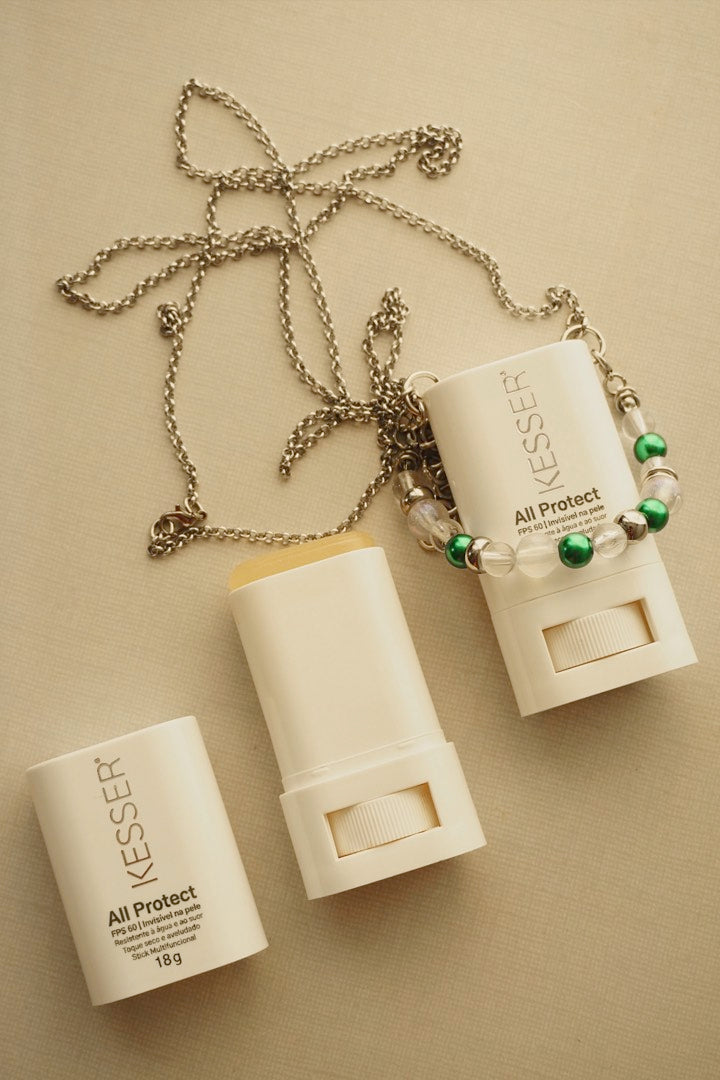 Ele une o All Protect FPS 60, com proteção ampla e toque confortável, ao KESSER Solar Strap, permitindo que a proteção solar seja dobrada e o protetor esteja sempre junto ao corpo, pronto para reaplicação ao longo do dia.